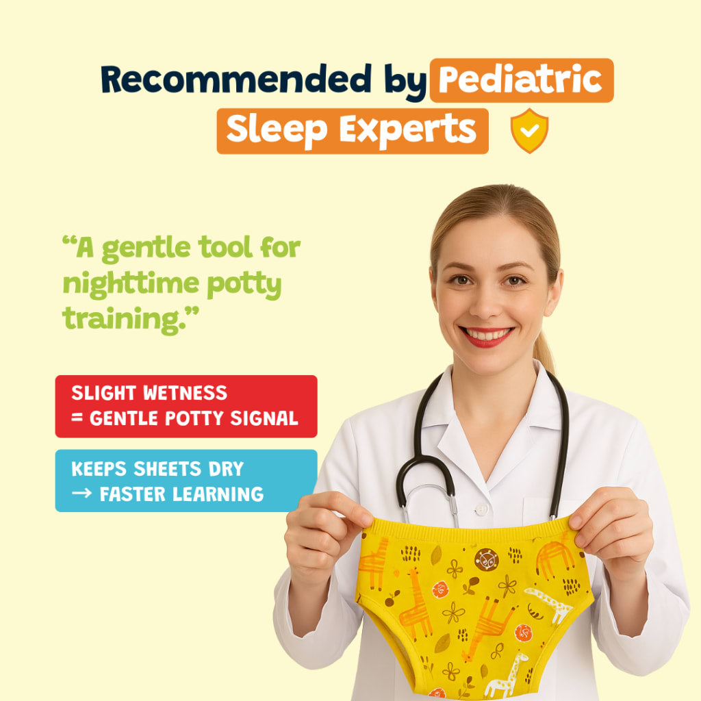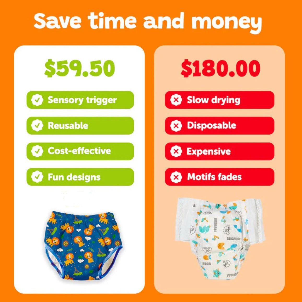 Unlike diapers, they’re reusable and look like real underwear, with strong absorption that still lets the child feel dampness, key for learning.Bedwetting alarms can be intrusive and stressful, waking up the whole family. Night training underwear offer a gentle, effective alternative for peaceful nights.
