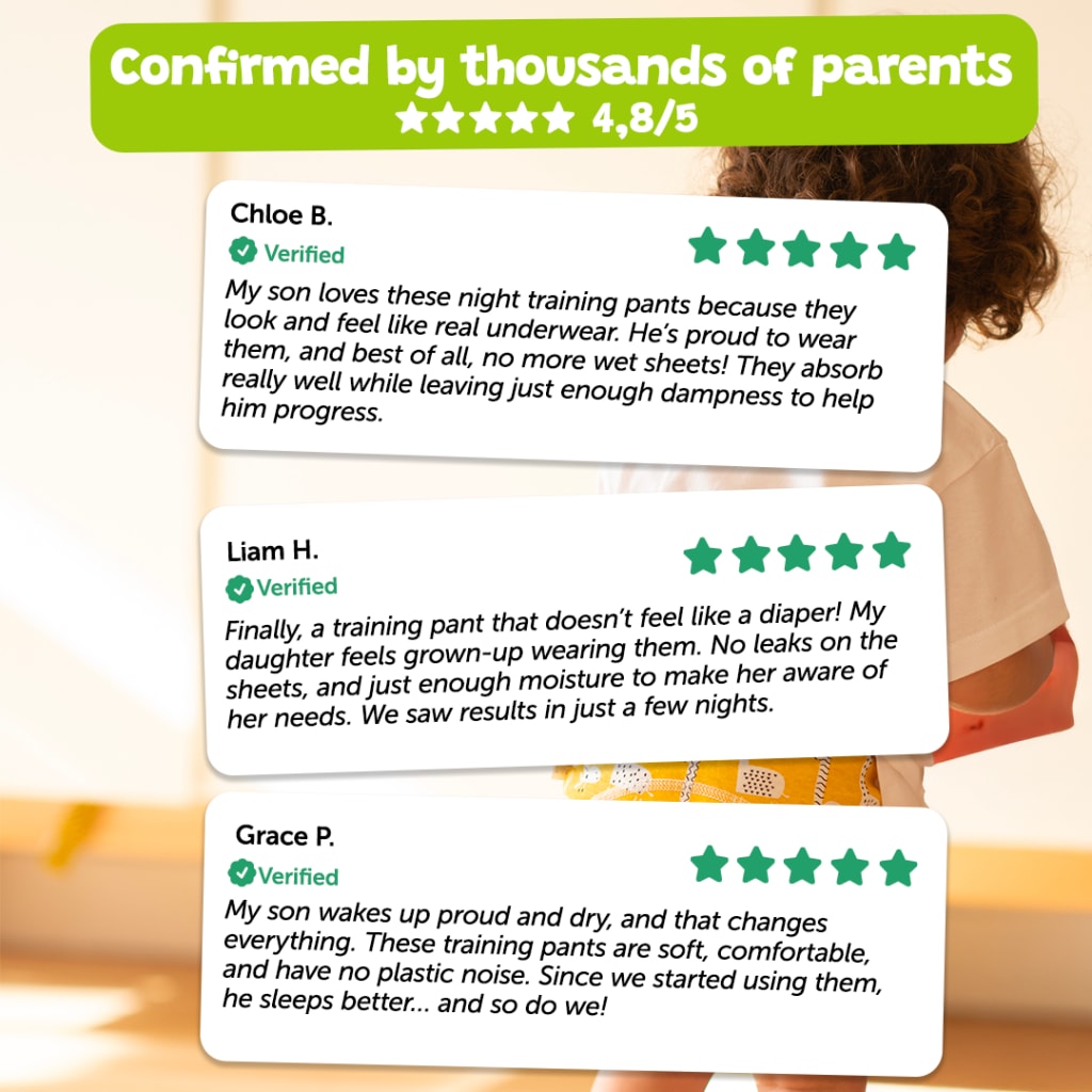 Night training underwear is a reusable garment specially designed for nighttime. It provides reinforced absorbent protection (up to 12 hours) to prevent leaks during sleep, while still helping your child become more independent and aware of their needs.